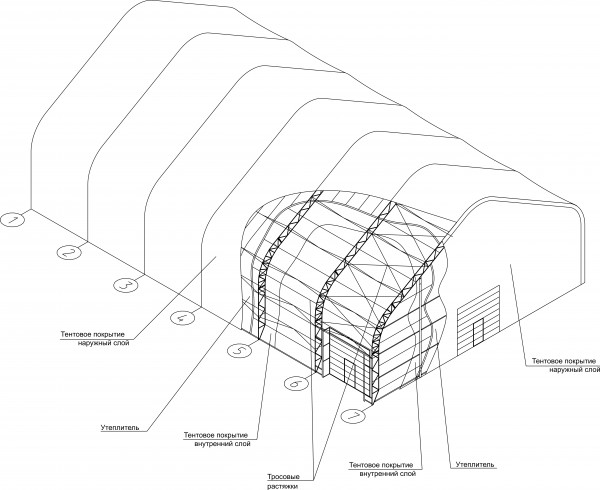 Состоит из трубы, установленной на заранее подготовленную траншею, глубиной 400 мм с утрамбованной песчаной подсыпкой 100 мм. Труба устанавливается по периметру ангара. Каркас ангара крепится болтами к опорным плитам, приваренным к трубе.
