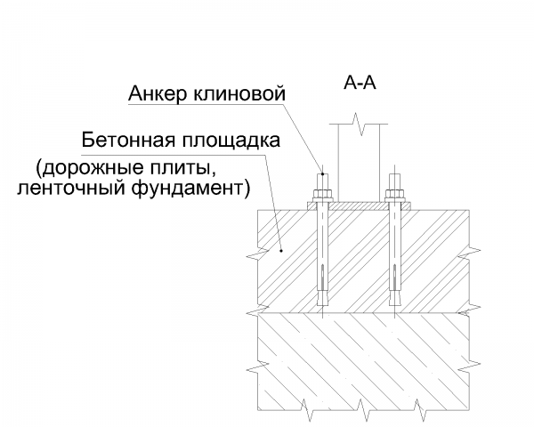 Данный ангар может быть установлен на площадку из дорожных плит ПДН размером 6x2 м толщиной 150 мм. Крепление каркаса к дорожным плитам осуществляется при помощи высокопрочных анкерных болтов .