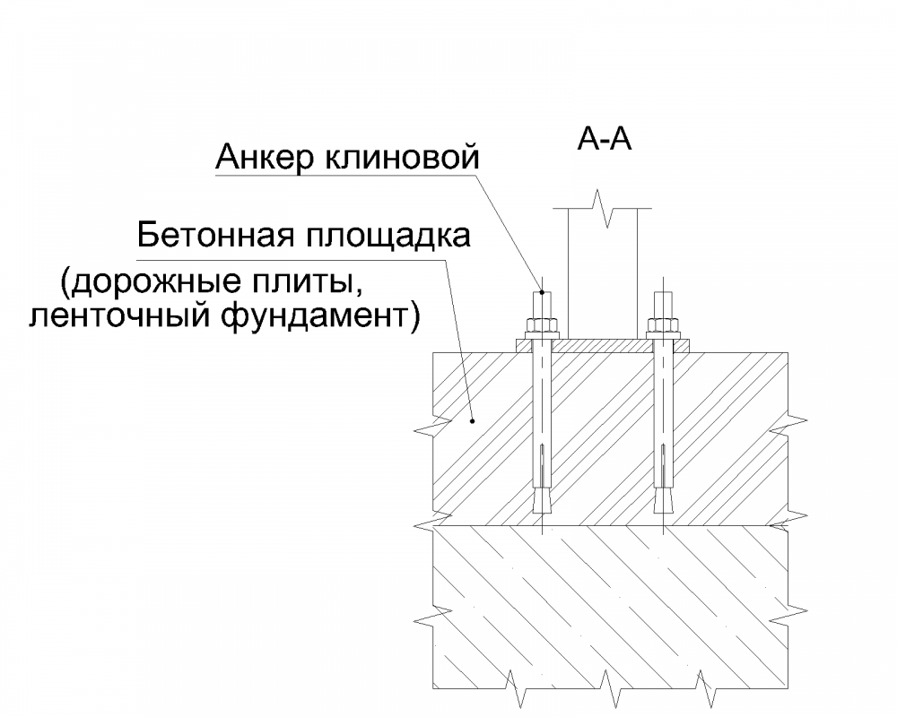 Данный ангар может быть установлен на площадку из дорожных плит ПДН размером 6x2 м толщиной 150 мм. Крепление каркаса к дорожным плитам осуществляется при помощи высокопрочных анкерных болтов .