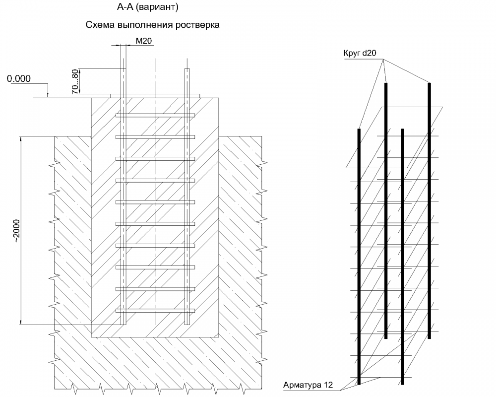 Состоит из трубы, установленной на заранее подготовленную траншею, глубиной 400 мм с утрамбованной песчаной подсыпкой 100 мм. Труба устанавливается по периметру ангара. Каркас ангара крепится болтами к опорным плитам, приваренным к трубе.